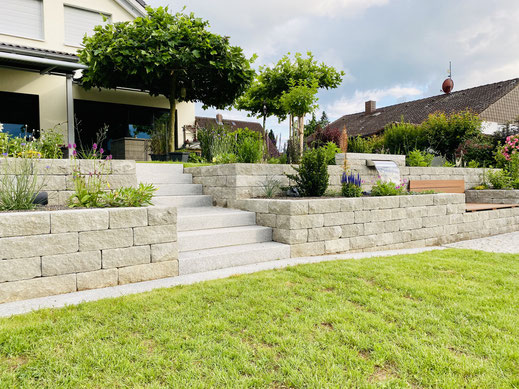Natürlich verarbeiten wir für Sie auch sämtliche andere Materialien! Hierzu gehören beispielsweise Belagsflächen aus Naturstein oder Beton, Palisaden, Natursteinmauer oder Trockenmauer in gleichmäßigen Reihen oder mit gesägten Fugen, Zyklopenmauer, Treppenbau und Stubensandstein.